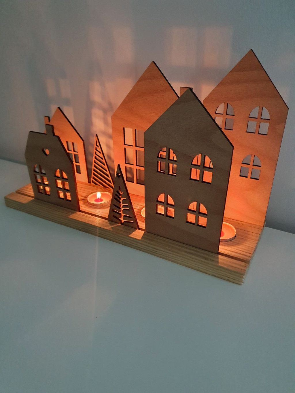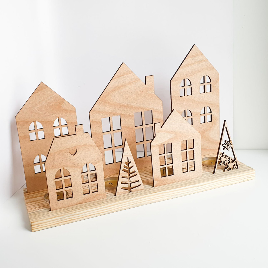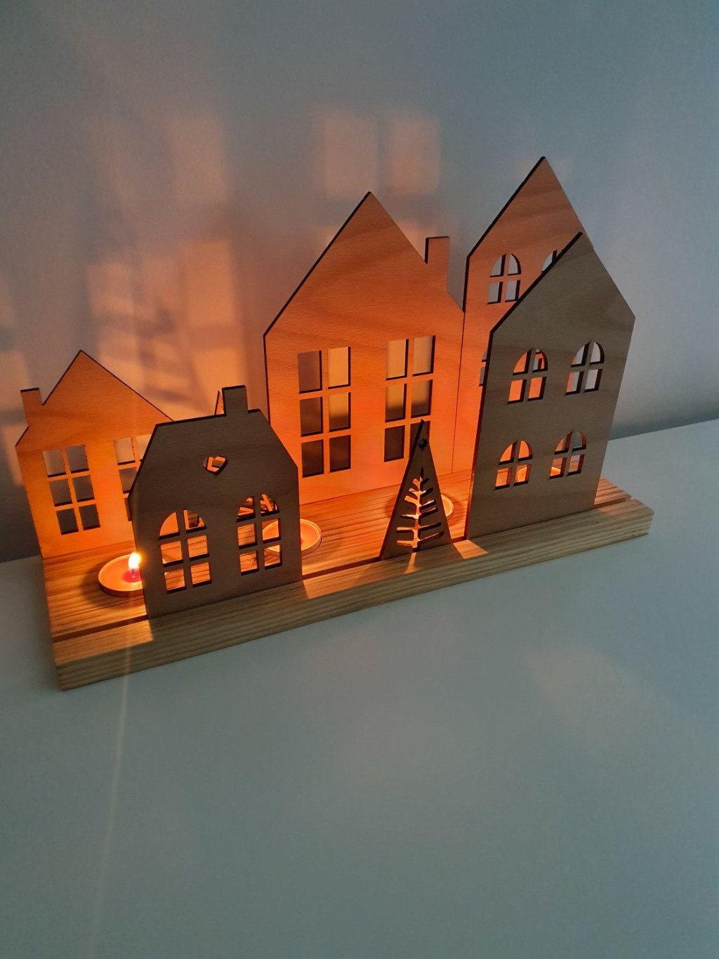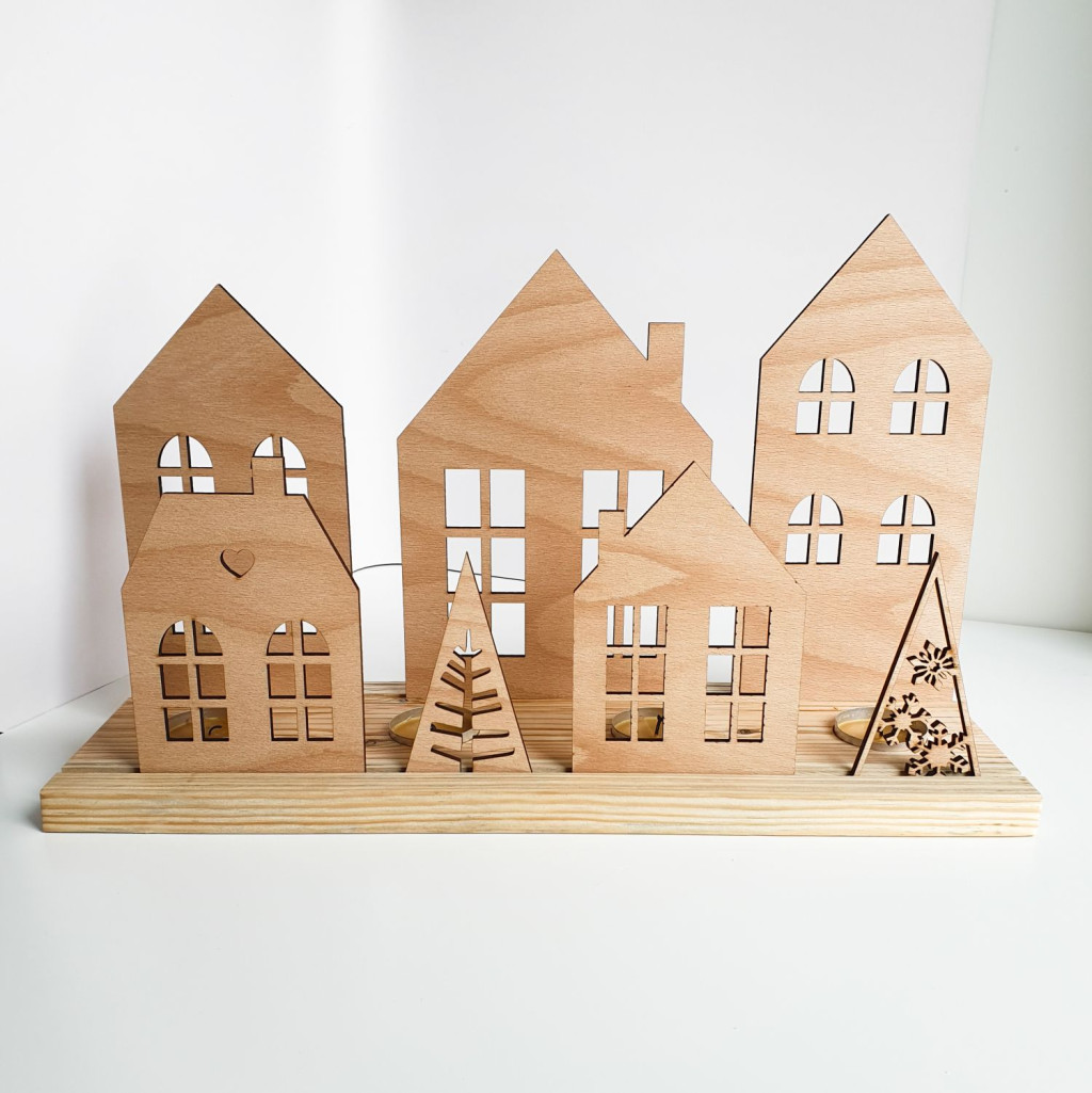 A fa gyertyatartó négy darab teamécsesnek biztosít helyet, valamint két előre vágott mélyedéssel rendelkezik, amelyekbe a fából készült házikók egyszerűen becsúsztathatók. A házakat kedvedre rendezheted, ahogy neked tetszik.