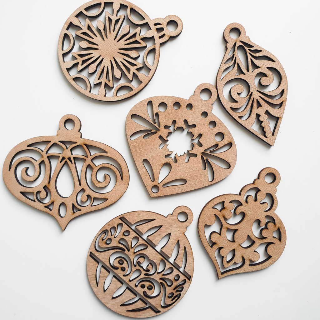 6 db fából készült karácsonyfadísz (különböző formák: gömb, csepp, hosszúkás)
