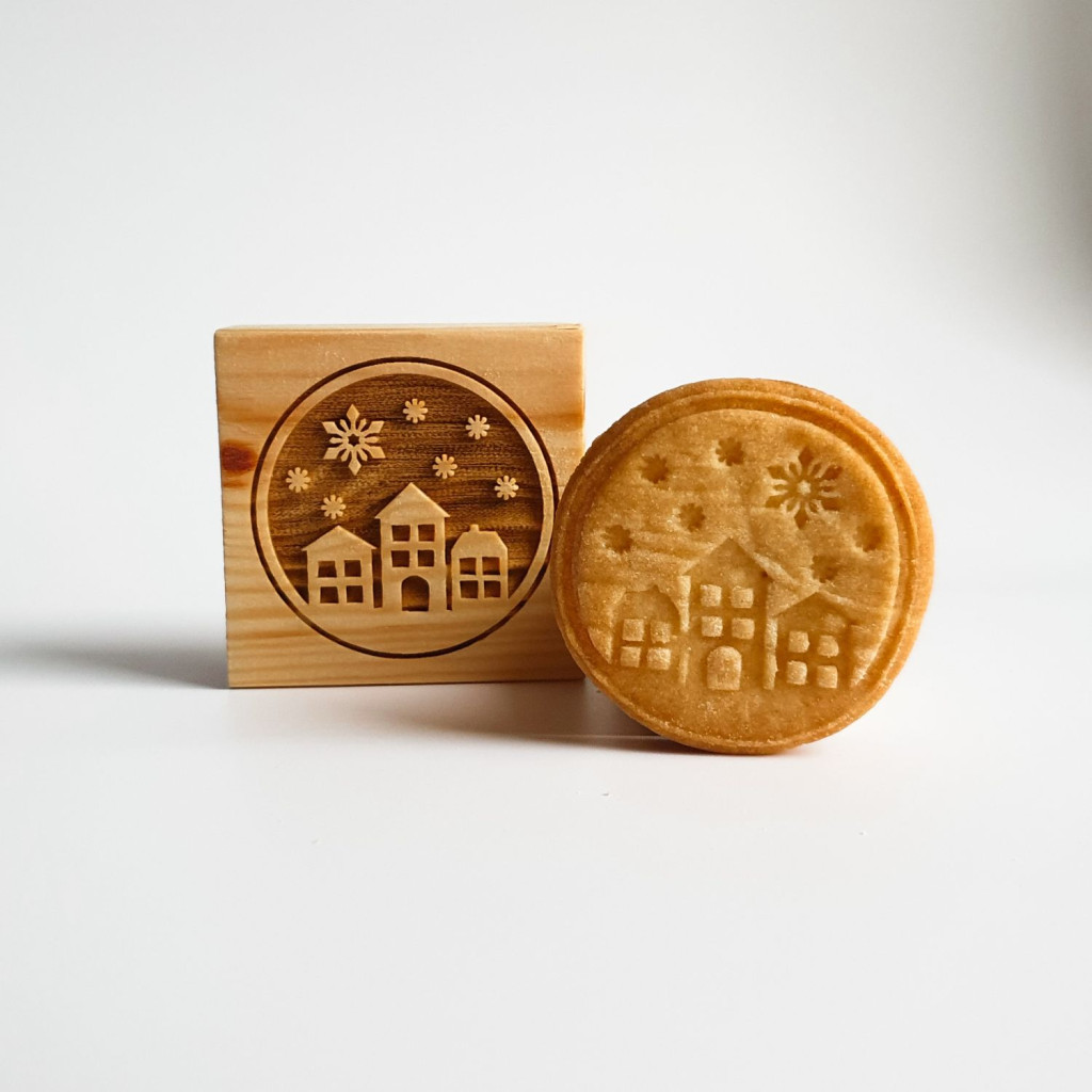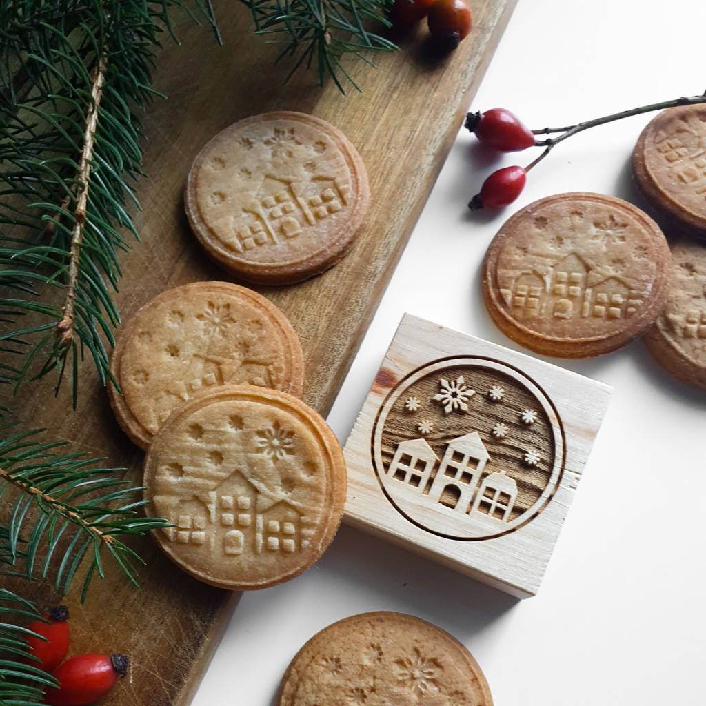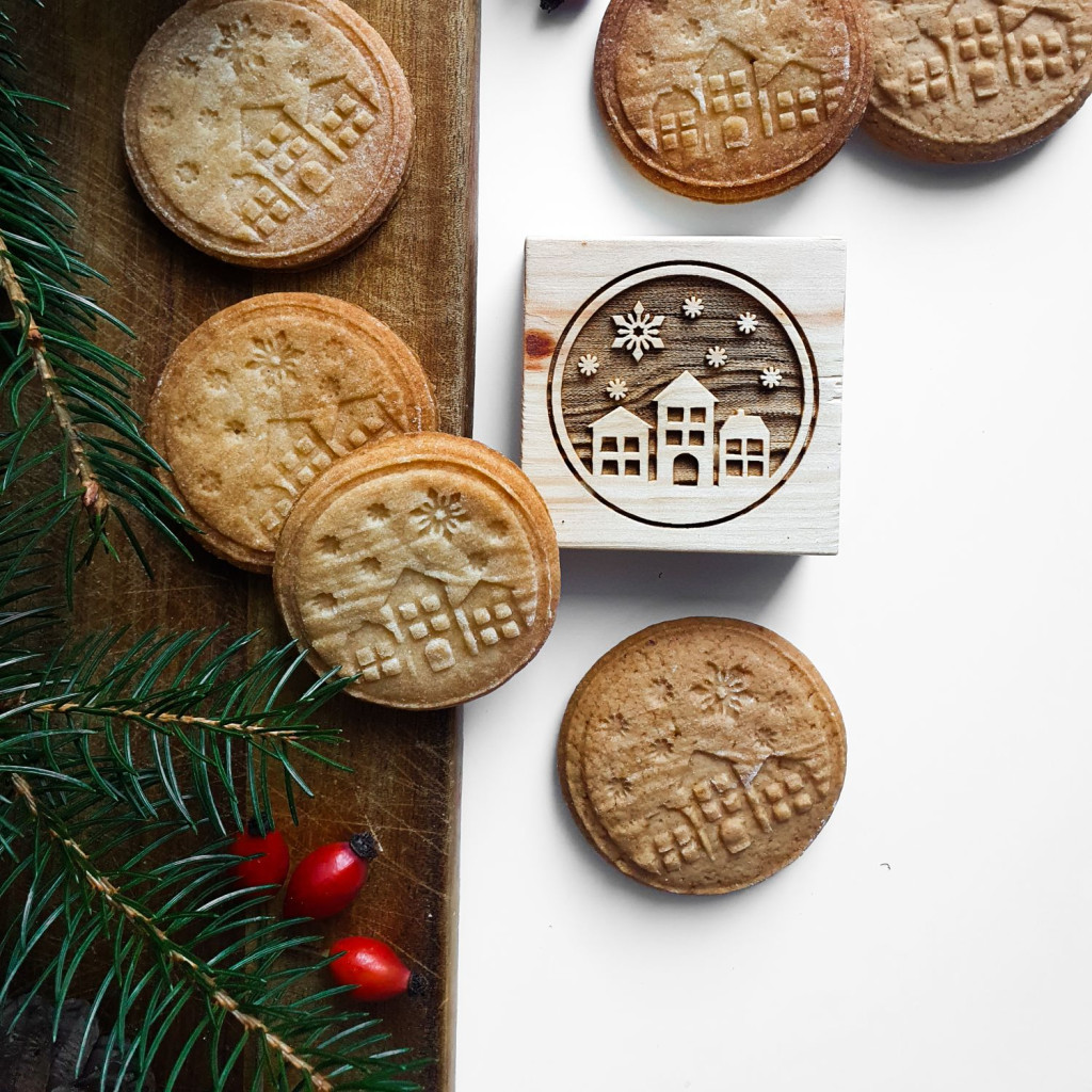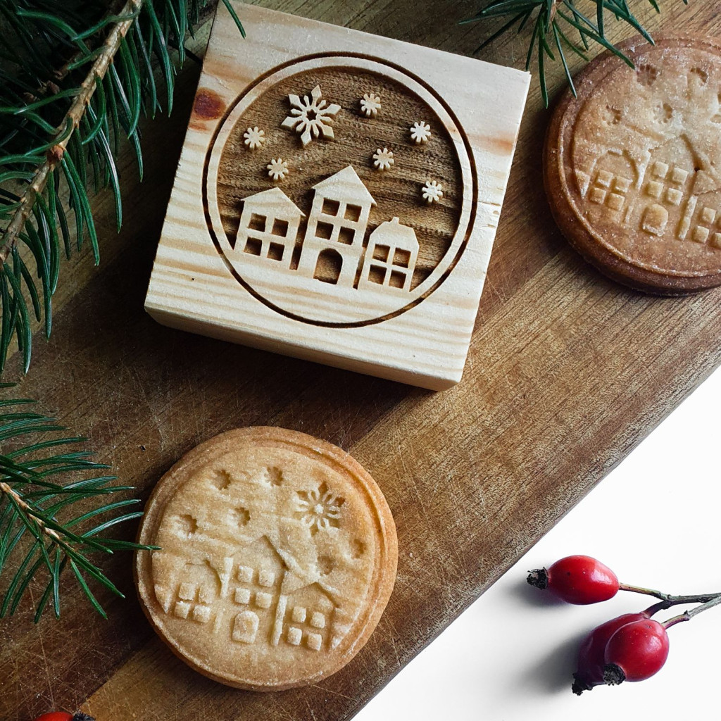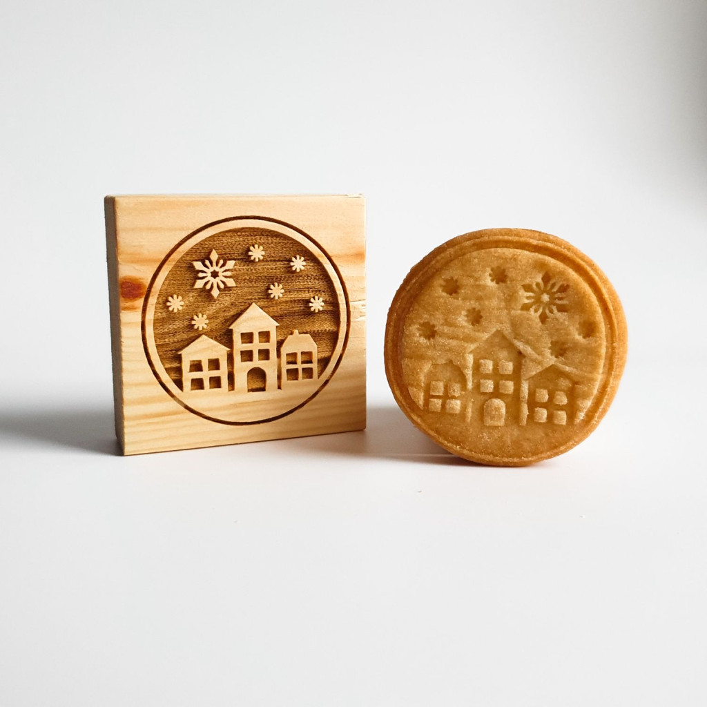 házak és hópelyhek mintájú keksz és fából készült kekszpecsét