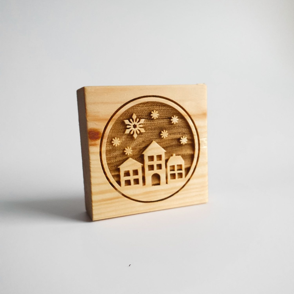 házak és hópelyhek mintájú fából készült kekszpecsét