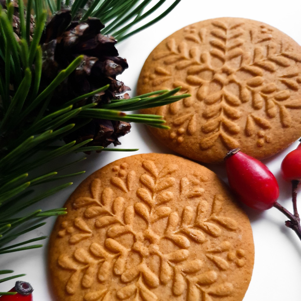 Levél hópehely mintájú fa sütipecsét, mézeskalács és spekulatius kekszek